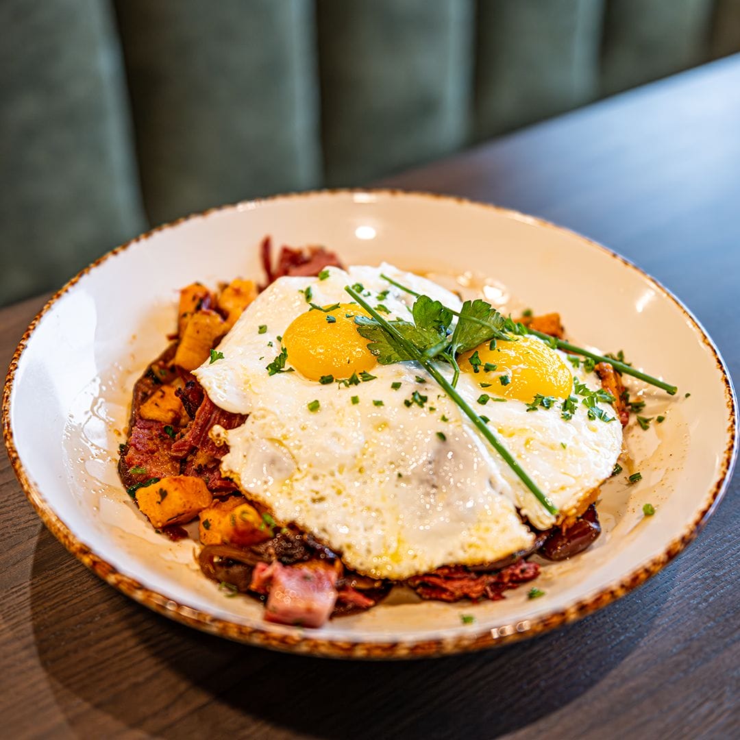 Cheddar, Nueske’s bacon, ham or chorizo, brioche bun, chive onion garlic cream cheese, arugula (no toast or pancakes).